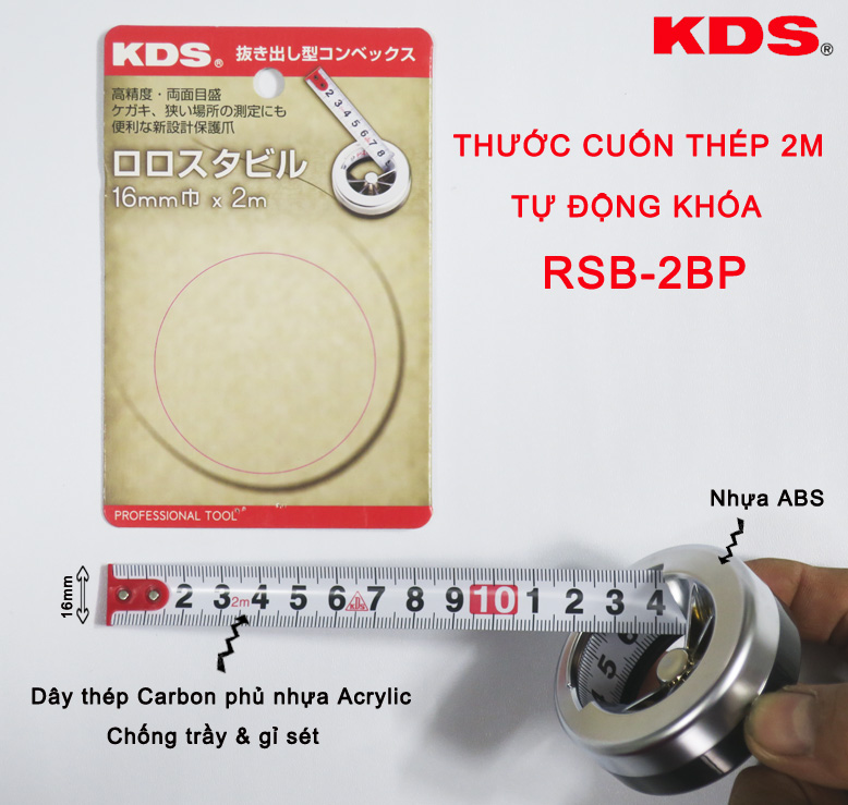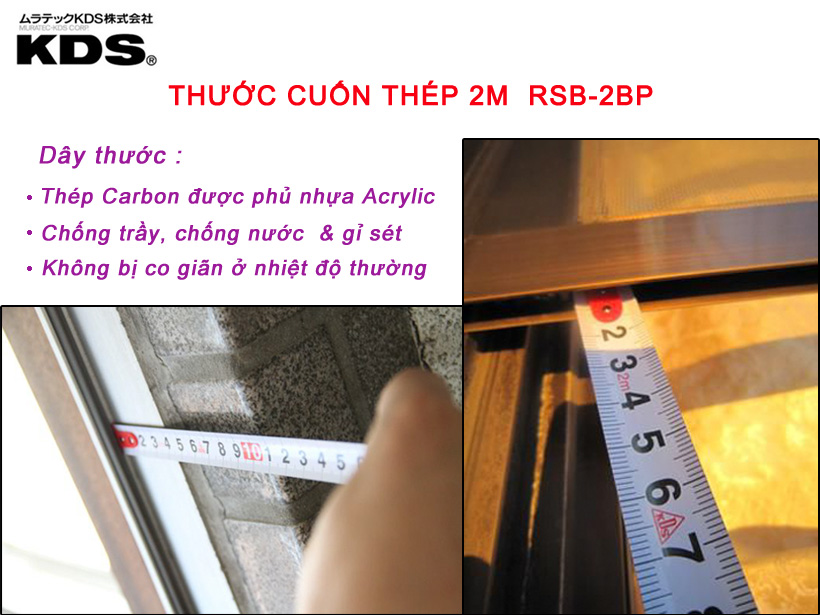 - Dây thước cuốn thép 2m tự động khóa KDS RSB-2BP có cấu tạo 3 lớp giúp trống trầy và chống gỉ sét. Bên ngoài dây được phủ nhựa Acrylic chống gỉ không bị co giãn bởi nhiệt độ môi trường, dây thước còn có khả năng chống nước, nhiệt độ, độ ẩm và các hóa chất.