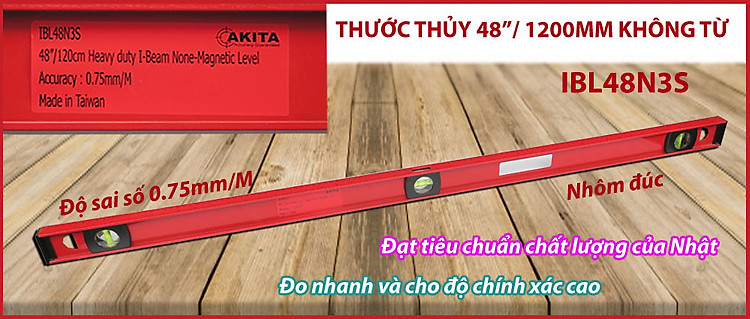 - Thước thủy không từ, hình H Akita IBL có kích thước nhỏ gọn, chất liệu là nhôm và phủ sơn epoxy chống gỉ giúp sản phẩm có độ bền và chịu được lực va đập ở các công trình. Sản phẩm sử dụng để đo góc cho những vật dụng, thí nghiệm, hay dùng để đo đạc, tính toán trong nhiều ngành, lĩnh vực khác nhau, nhất là dùng để kiểm tra chất lượng của công trình xây dựng.
