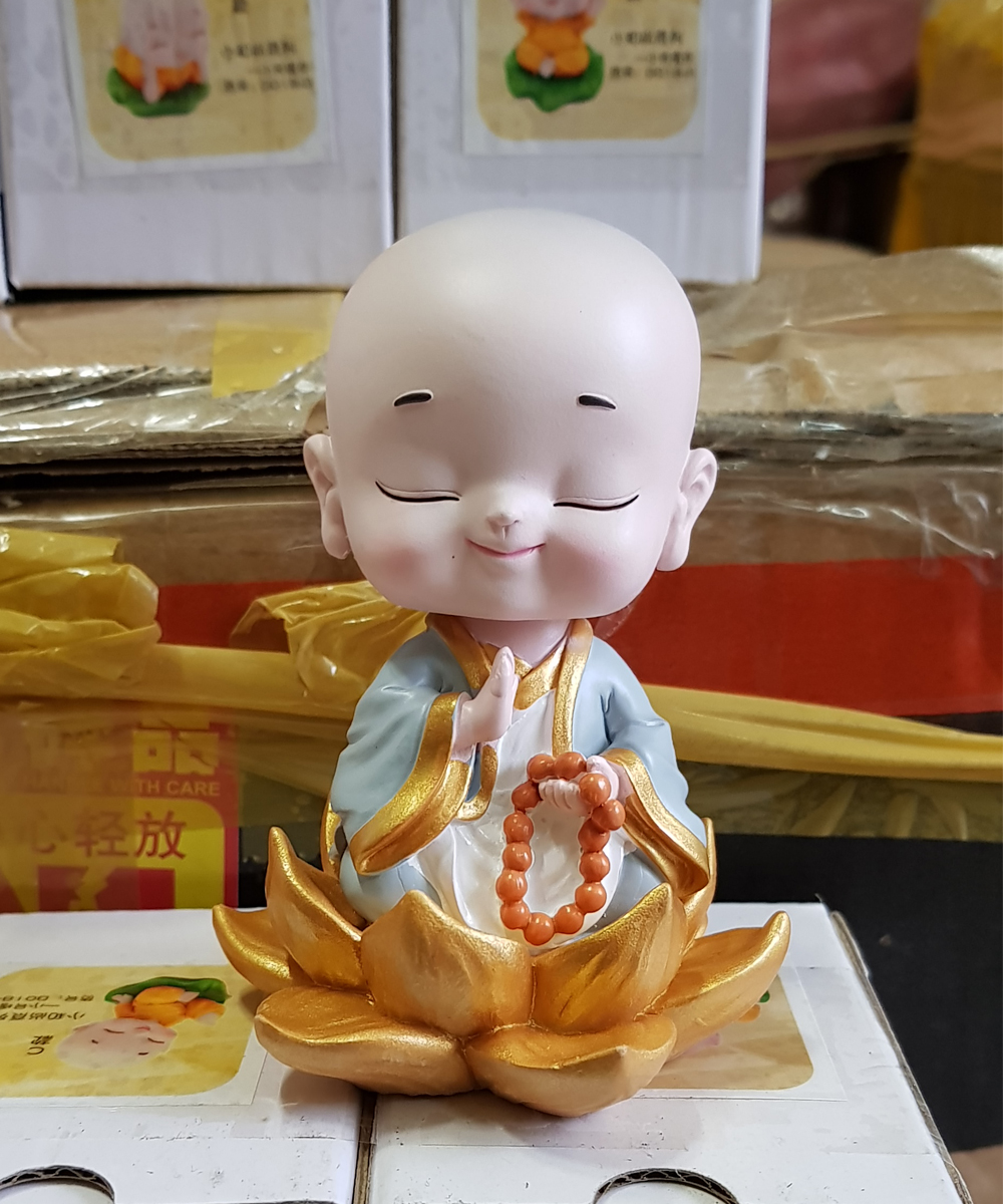 CHÚ TIỂU NGỒI LÁ SEN+ Kích thước: ngang 4.4cm x rộng 4.3cm x cao 6cm+ Chất liệu: Nhựa thông+ Có 02 màu áo: vàng / xanh lam Tượng chú tiểu lò xo ngồi đài sen+ Kích thước: ngang 6.4cm x rộng 7.4cm x c...
