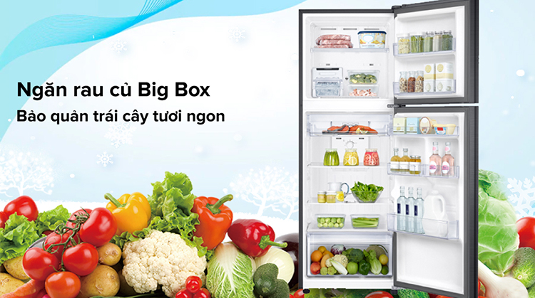 Ngăn rau củ lớn giữ ẩm Big Box có dung tích lớn và thiết kế dạng ngăn kéo giúp tối ưu nhiệt độ của rau củ, bảo quản chúng tươi ngon lâu hơn.