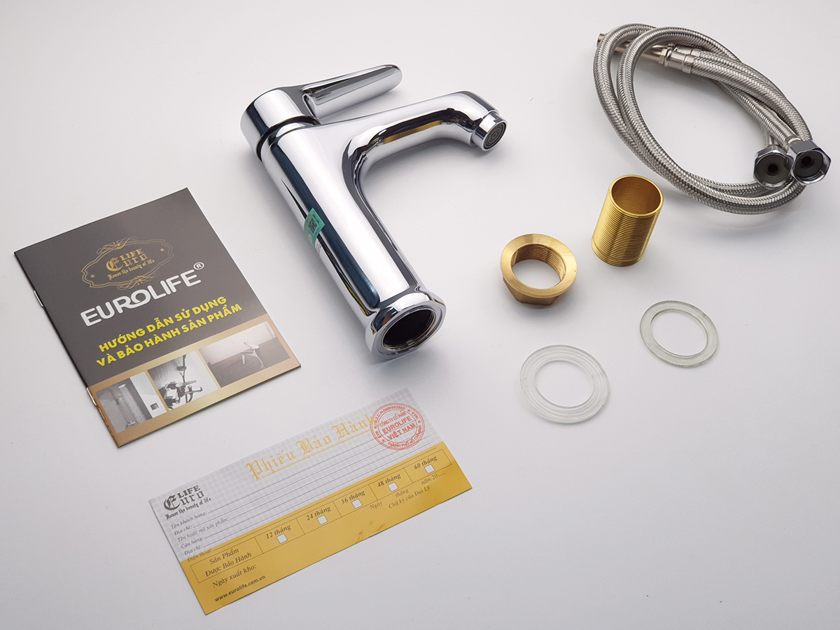 - Bộ sản phẩm được đóng gói trong túi vải cotton, hộp màu riêng của Eurolife. Bộ sản phẩm đầy đủ bao gồm : Thân vòi Lavabo, 1 bát gắn, 2 roong cao su, 2 dây cấp 60cm, 1 phiếu bảo hành chính hãng.